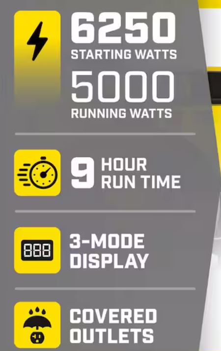 • 6250 starting watts and 5000 running watts, enjoy up to 9-hours of run time on a full tank of gasoline with a noise level of 74 dBA from 23 ft.