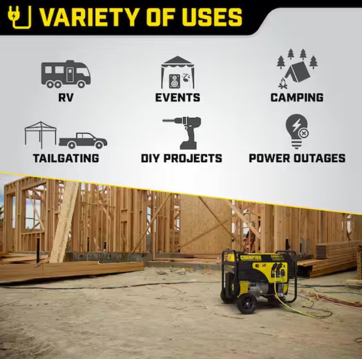 The Champion Power Equipment 100812 5000-Watt Portable Generator is the perfect combination of versatility and convenience. An ideal companion for your next-weekend project or wherever you might need additional power, this generator can also provide plenty of backup power for your essentials during an outage. Designed for safety with convenient push-to-reset circuit breakers, a low oil shut-off sensor plus an included oil funnel for easy changes, this unit includes 1.2 qt. of recommended 10W-30 engine oil. The reliable 292 cc single-cylinder OHV Champion engine produces 6250 starting watts and 5000 running watts, and will run for up to 9-hours at 50% load when the 5.7 gal. tank of gasoline is full. Easily monitor power output and track maintenance intervals with Intelligauge, which allows you to keep track of voltage, frequency and operating-hours. All the outlets have covers for protection and include a 120-Volt/240-Volt 30 Amp locking outlet (L14-30R) and 4 120-Volt 20 Amp GFCI protected household outlets (5-20R). There's no need to worry about your equipment and appliances since our Volt Guard built-in surge protector prevents overloads and keeps your equipment safe from spikes in voltage. This generator is EPA certified and CARB compliant.