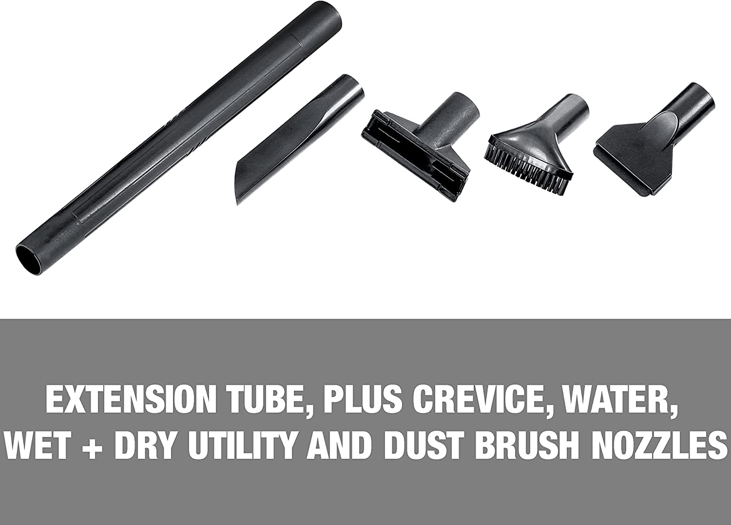 • 6-PIECE ACCESSORY KIT: Comes with an extension tube, crevice nozzle, water nozzle, wet + dry utility nozzle, dust brush nozzle, carrying bag