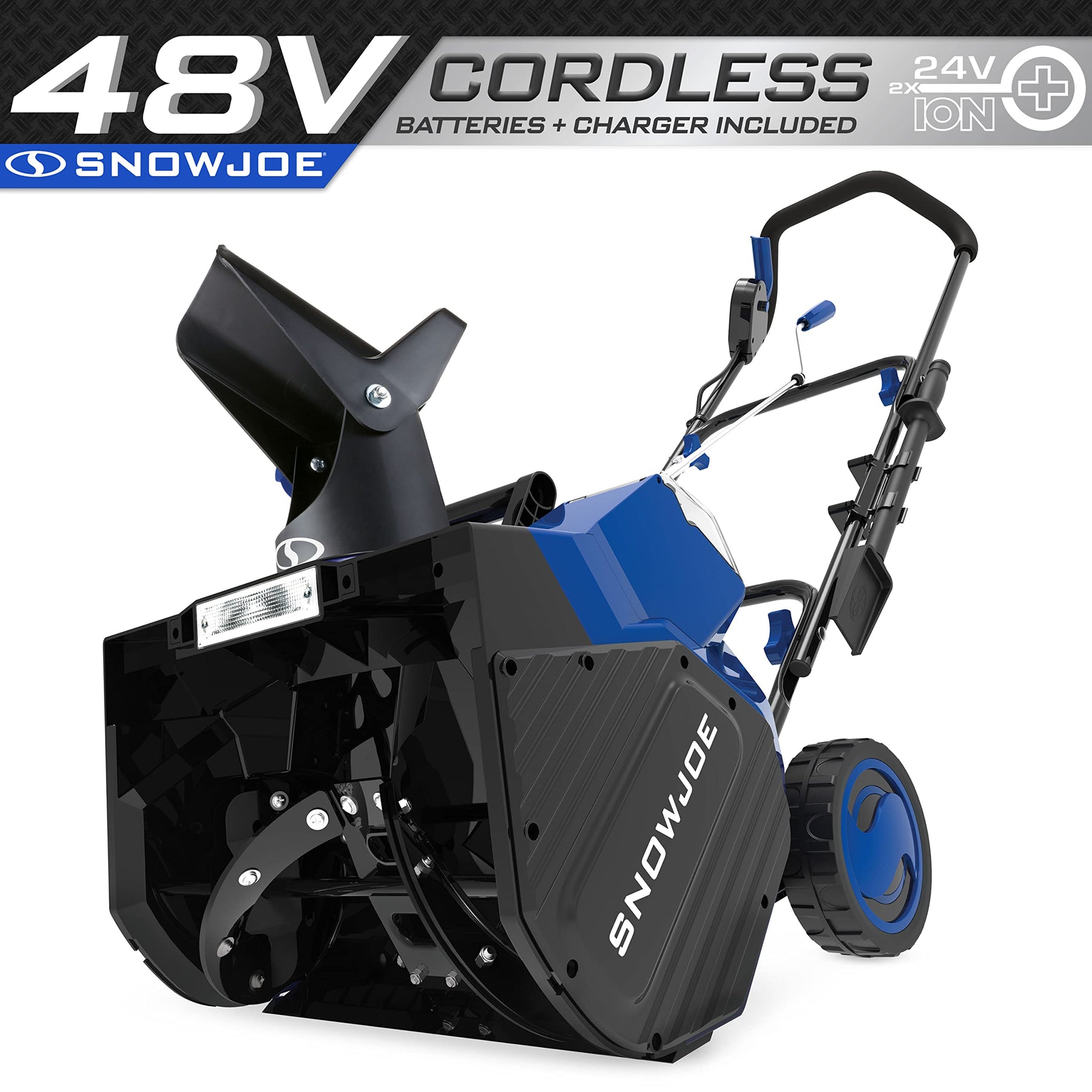 \When it comes to snow, go with Joe. Meet the latest revolution in cordless snow-clearing technology: 24V-X2-SB18 ion+ 48V 18" Cordless snow Blower from Snow Joe. Powered by Snow Joe exclusive ion+ 24V lithium-ion battery system, the two included 4. 0 Ah batteries provide up to 40 Min of rechargeable runtime, with zero carbon emissions for cleaner air. Cut the cord with ion+ cordless convenience to blast past the limits of an extension cord, & go anywhere power is at a premium. Equipped with a heavy-duty, rubber-tipped steel blade auger, Snow Joe clears an 18" Wide by 10" Deep path in a single pass. The powerful 1200W brushless motor plows throughup to 14 Tons of snowper charge —up to 700 lbsper Min — while the integrated scraper bar at the base of the unit clears right to the ground without damaging your deck, driveway or pavement. Put the powder precisely where you want it: Snow Joe adjustable chute control rotates 180 to throw snowup to 20' Away in any direction! & after dark, The integrated 2W LED headlight lights The way for safer nighttime clearing. When there’s more work to be done, boost your battery power with even more ion+ options online; or get equipped with a S set of iON+ batteries, to keep throwing when it just won’t stop snowing! When winter strikes, fight back with 48V of snow-shredding power. 24V-X2-SB18 48V 18" Cordless snow Blower from Snow Joe.
