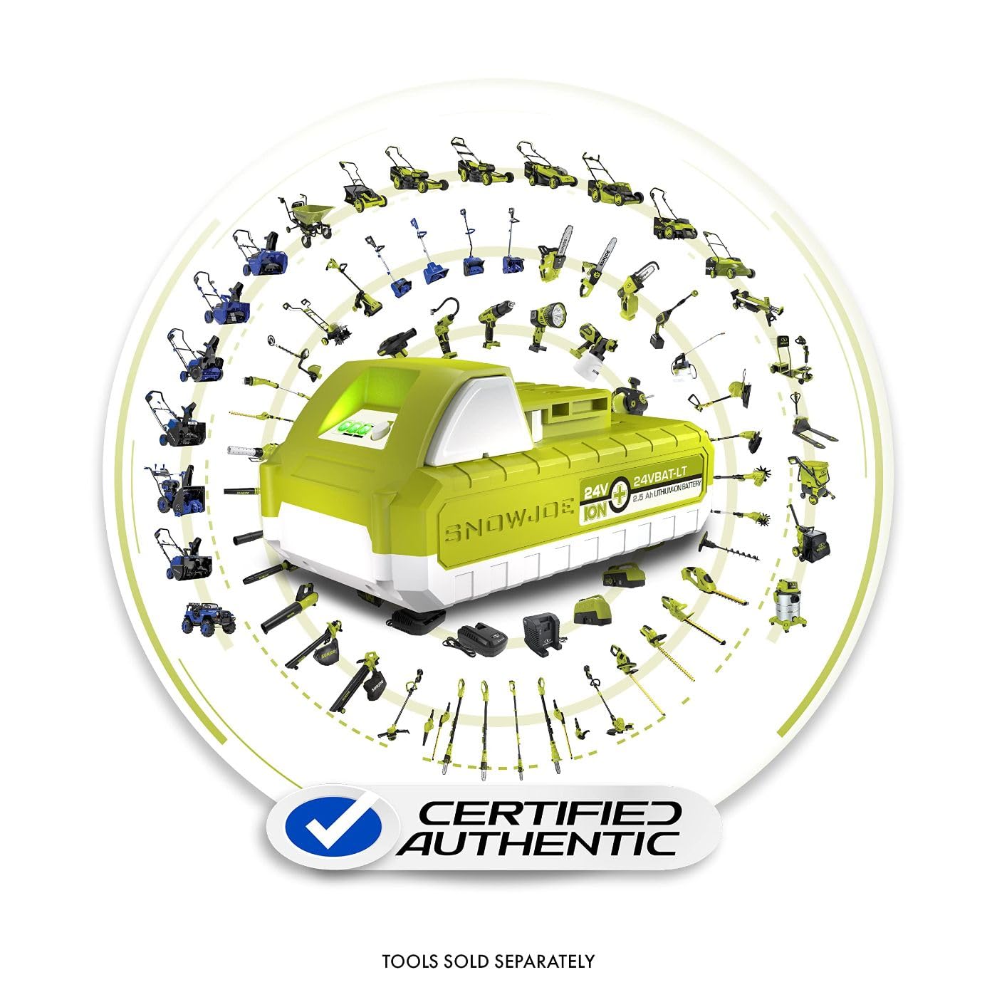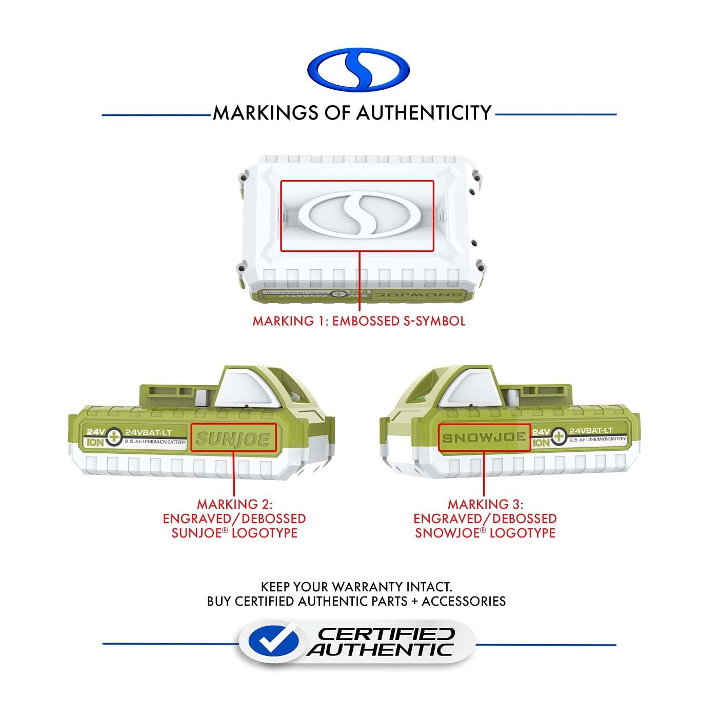 • [CERTIFIED AUTHENTIC]: Official Snow Joe + Sun Joe battery with valid markings of authenticity. Use of non-authentic accessories with your Snow Joe + Sun Joe tool will void your tools warranty.