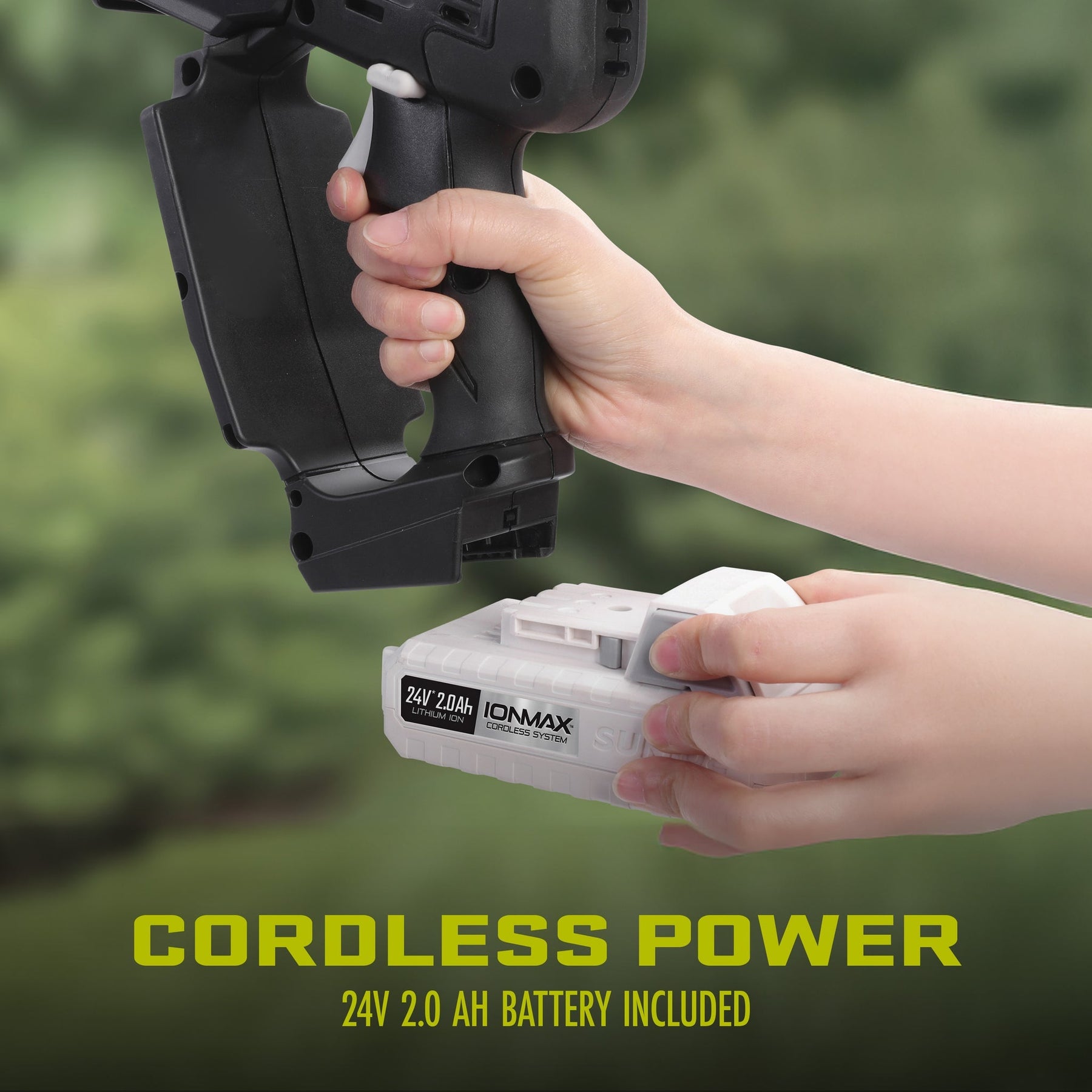 New for this season, Sun Joe cuts a max thickness of 5.5 inches, the largest of any hand held chainsaw we have offered, with 9 multi-angle head positions, and features an IONMAX 24-volt* lithium-ion battery, charger, removable battery compartment, wrench, and bar and chain oil.