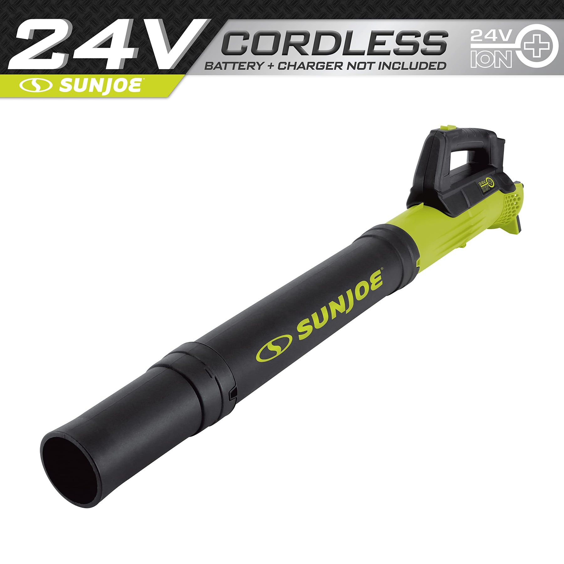 Make cleanup A breeze! Say goodbye to blisters & give your back A break – tiring lawn & leaf cleanups are a thing of the past with 24V-TB-CT 24V cordless compact turbine jet blower from Sun Joe. Powered by ion+, The exclusive, eco-friendly 24V lithium-ion battery system. Ion+ provides 4 batteries options (battery + charger sold separately) that provideup to 30 Min of rechargeable runtime with no-fade power + performance. Ion+ is compatible with snow Joe + Sun Joe Complete 24V cordless tool universe. Quickly sweep the garage, garden, deck, driveway & more With the perfectly portable cordless convenience of Sun Joe. Like an aircraft, 24v-tb’s turbine fan propels the wind speedup to 100 mph & 280cu.'.Per Min to make yardwork a breeze & leave your yd spotless. With a sleek, compact, aerodynamic design to maximize airflow & optimize storage, Sun Joe 350W motor provides all the power you need to quickly clear away grass clippings, leaves, dirt & debris, or even light snow! So, when life gives you leaves, make cleanup A breeze. The 24V-TB-CT 24V cordless compact turbine jet blower from Sun Joe. Get equipped.