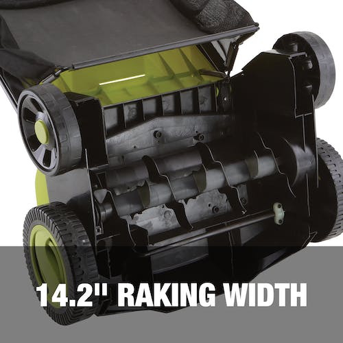 The 5-position depth control knob tailors the raking depth — from -0.18 in. (4.5 mm below the soil) to 0.4 in. (10 mm above the soil) — and the scarifying depth — -0.375 in. to 0.2 in. — to suit your lawn. And Sun Joe's included 10.6 gallon collection bag keeps your yard clear of debris.