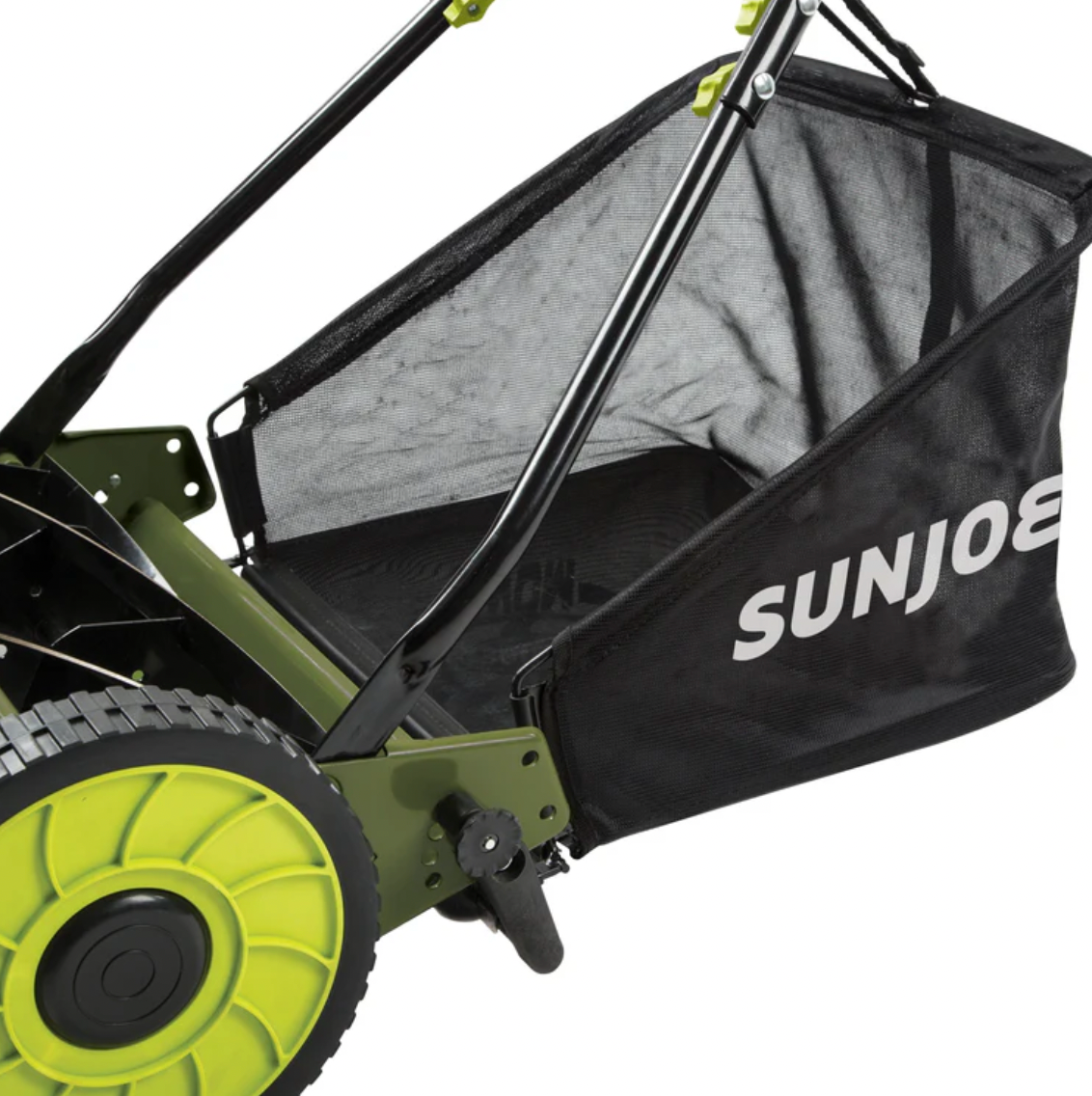 SEE JOE MOW. No messy gas; just an easy-to-use, lightweight, maneuverable and economical push reel mower. The Sun Joe MJ500M Reel Mower with Grass Catcher handles tough turf with ease and provides a quiet, eco-friendly solution for any lawn. The MJ500M comes with a handy rear collection bag to help keep your yard nice and tidy. Powered by you, the Sun Joe MJ500M has a 16-inch wide cutting path with a 4 position height adjustment lever. The Sun Joe comes with a 2-year full warranty.