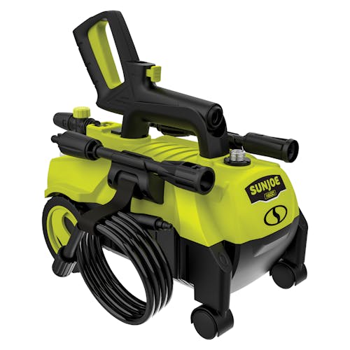 MADE TO MOVE. You Name It. You Aim It. Grime Is Gone. Make your cleaning chores more mobile with the perfectly portable SPX3160P-SJG 11-Amp Go Anywhere Pressure Washer, from Sun Joe. With a compact, lightweight design and sturdy swivel wheels, you’ll be able to clean anywhere around your home with less hassle as you roll from one project to the next! Equipped with a peak-performance 11-amp motor, this portable powerhouse blasts up to 1600 PSI max to quickly eliminate greasy residue from concrete, heavy mildew stains, oil stains, caked-on mud, and other stubborn gunk and grime, and 1.45 GPM max to rinse it away. The convenient onboard, 10 fl oz foam cannon is perfect for transporting your favorite soapy solution and aerating the foam for a thorough lather. Adjust your spray to suit the task, too—the 0-45 twist-adjust spray nozzle makes it easy to tackle a host of household chores, without wrestling with separate fittings. Other superior features include a garden hose adapter (female coupler); wheel + rim brush to bring out the sparkle and shine in wheels, rims, and tires; utility brush for windows, patio furniture, autos, boats and BBQs; rotary brush to spin and scrub away stubborn dirt, debris, gunk + grime; and needle clean-out tool.